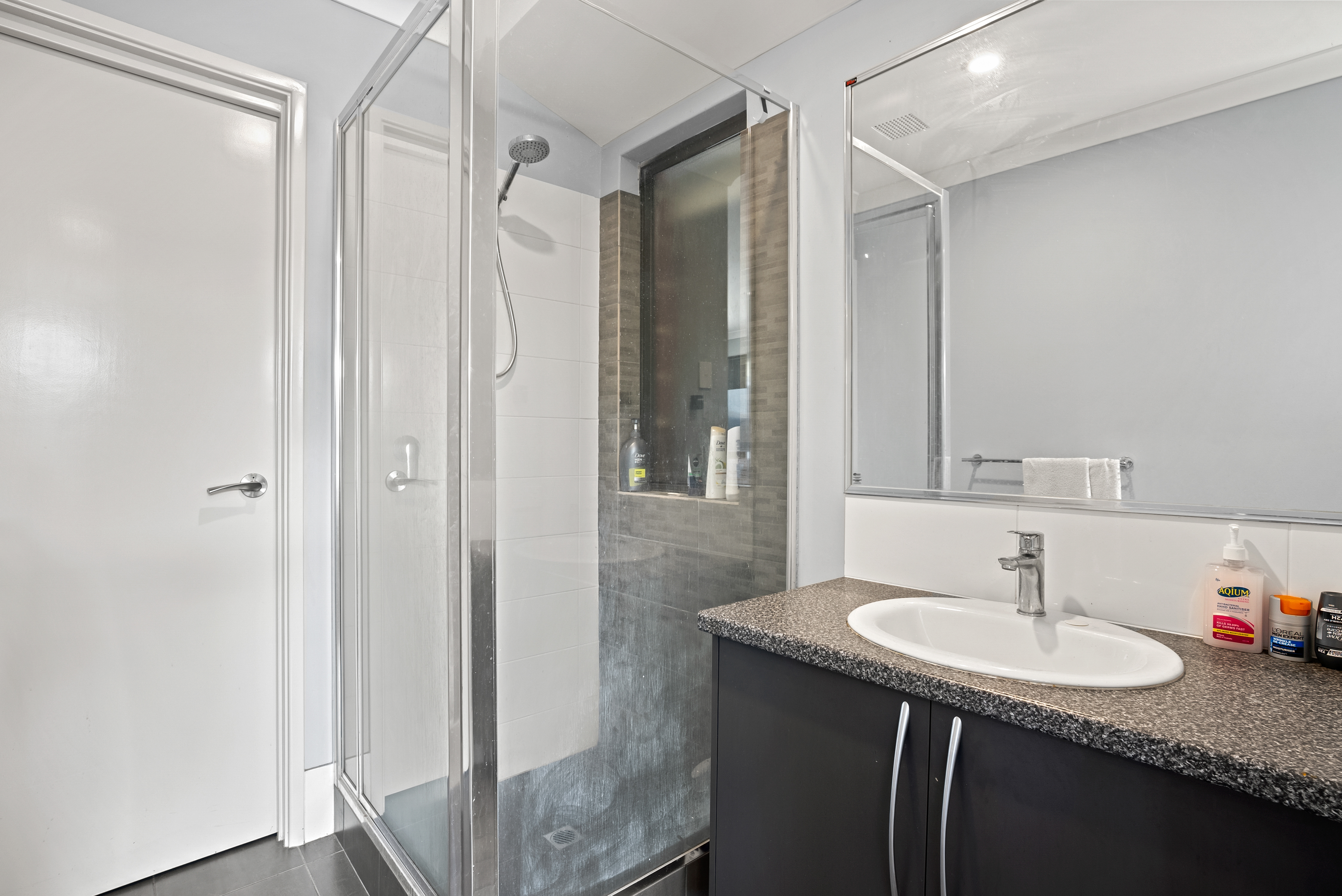 • Contemporary bathroom with sleek vanity, mirrored cabinet and glass shower recess