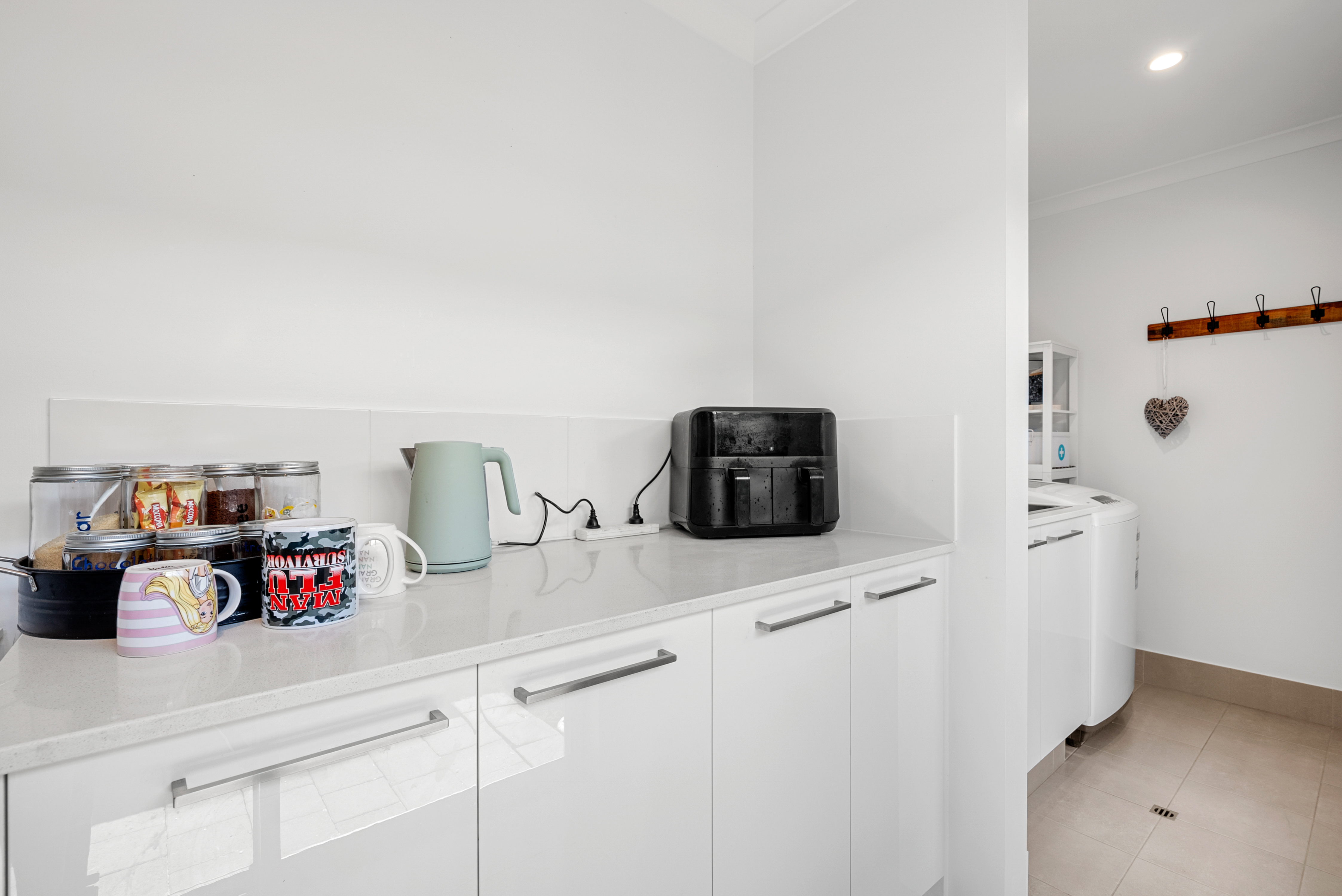 - Designer Kitchen with Scullery: Large island breakfast bar, crisp white cabinetry, 900mm stainless steel oven and cooktop, plus a practical scullery for prep, storage, and hidden appliance space.