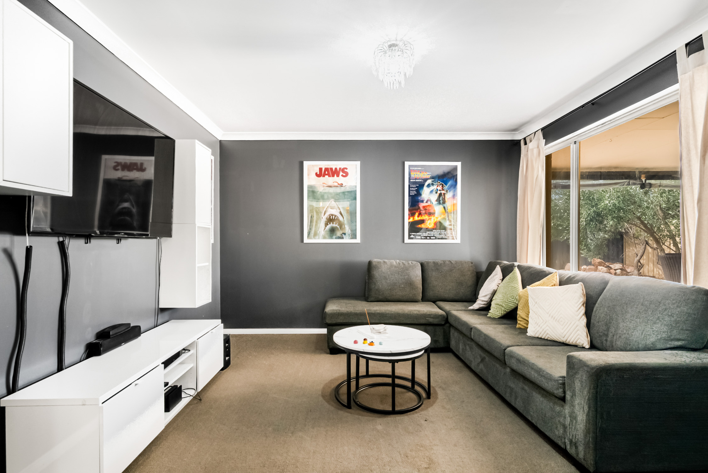 • Separate theatre-style living room with charcoal feature walls and split-system air conditioning