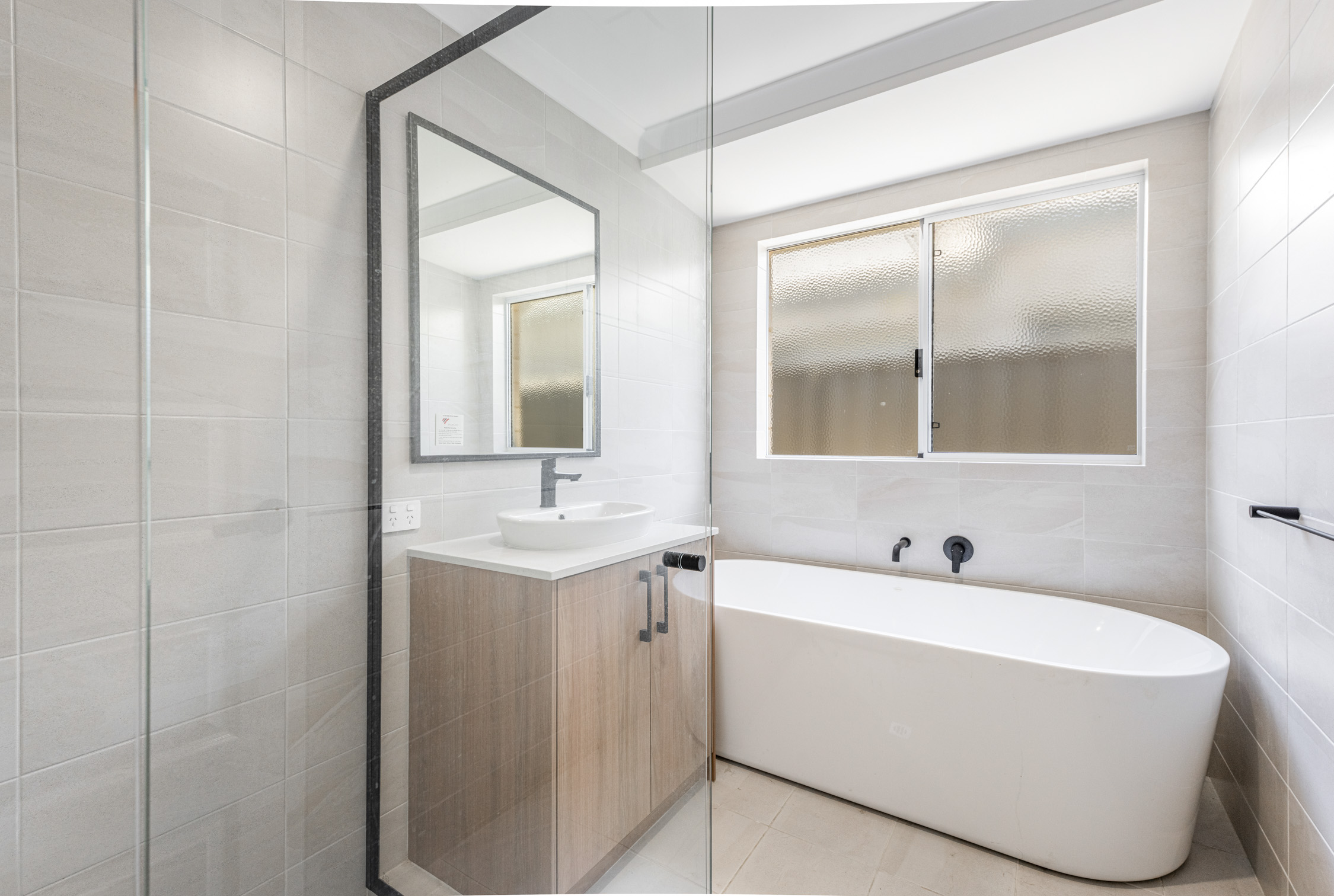 • Stylish main bathroom featuring a freestanding soaking bath and semi-frameless shower