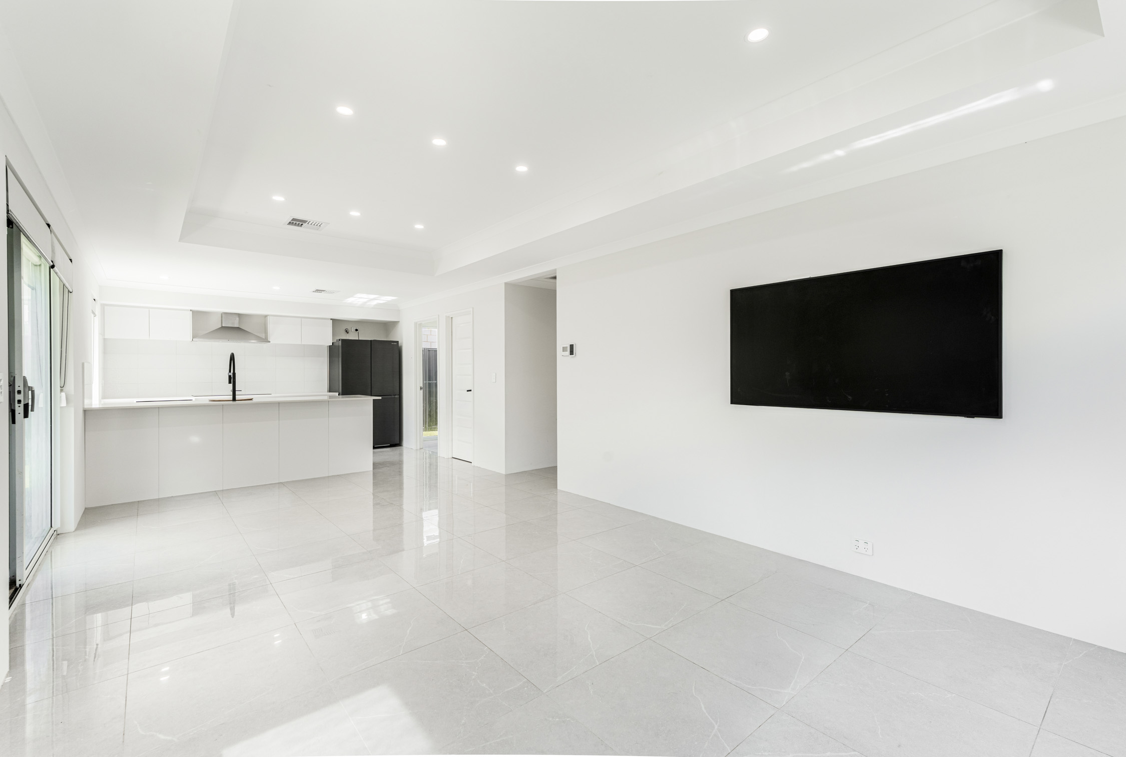 • Open-plan living and dining area with high recessed ceilings and oversized contemporary tiles